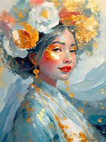 Dit digitale kunstwerk (techniek paletmes) is een portret van een elegante Japanse vrouw gekleed in zachte zijde met gouden accenten en bloemen van goud in haar haren.
