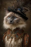 Een karaktervol kattenportret in de stijl van de oude meesters waarin de kat is gekleed in een fluwelen kostuum en gevederde hoed, subtiel uitgelicht tegen een warme achtergrond. De schilderachtige afwerking en de rijke stoffen brengen sfeer, mysterie en verfijning samen in één opvallend kunstwerk. Dit werk staat schitterend in klassieke en romantische interieurs en geeft direct een artistieke signatuur aan woonkamer, bibliotheek of praktijkruimte.