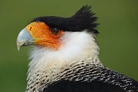 Een portret van een Kuifcaracara tegen een groene achtergrond. Deze roofvogel komt voor in Zuid-Amerika.