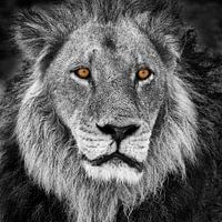 Monochroom kop portret van een mannetjes leeuw met oranje ogen. De foto is in zwart wit maar de ogen zijn oranje en toont de leeuw van voren. De de leeuw kijkt vrijwel recht in de camera.