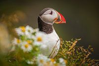 Dit werk toont een Papegaaiduiker zittend tussen de bloemen in een broedkolonie in het zuiden van IJsland. De kleurrijke vogel met opvallende snavel komt goed uit tegen een vage donkergroene achtergrond.