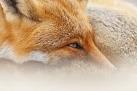 Een portret van een rode vos met mooie details van de vacht zijn goed zichtbaar en scherp. De staart heeft de vos voor zijn gezicht geslagen om zo warm te blijven.
