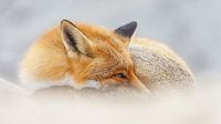 Een portret van een rode vos met mooie details van de vacht zijn goed zichtbaar en scherp. De staart heeft de vos voor zijn gezicht geslagen om zo warm te blijven.