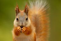 Grappig portret van een Rode eekhoorn (Sciurus vulgaris) die een noot zit te eten. Hij klemt de noot in de voorpoten. De eekhoorn is in close-up gefotografeerd vanaf de voorkant en het diertje heeft uitsluitend aandacht voor de noot in z'n voorpoten. De eekhoorn komt goed uit tegen een vage groene achtergrond. Ik fotografeerde dit knaagdier in de eindeloze Taiga van midden Finland