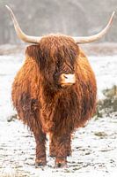 Portret van een Schotse hooglandvee in de sneeuw tijdens de winter. De Schotse Hooglanders worden gebruikt in het natuurbehoud van de Veluwe om ervoor te zorgen dat de heidegebieden niet dicht opeen groeien.