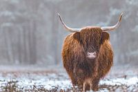 Portret van een Schotse hooglandvee in de sneeuw tijdens de winter. De Schotse Hooglanders worden gebruikt in het natuurbehoud van de Veluwe om ervoor te zorgen dat de heidegebieden niet dicht opeen groeien.