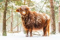 Portret van een Schotse Hooglander in de sneeuw tijdens de winter. De Schotse Hooglanders worden ingezet bij het natuurbeheer op de Veluwe om ervoor te zorgen dat heidegebieden niet dichtgroeien.