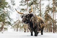 Portret van een Schotse Hooglander in de sneeuw tijdens de winter. De Schotse Hooglanders worden ingezet bij het natuurbeheer op de Veluwe om ervoor te zorgen dat heidegebieden niet dichtgroeien.