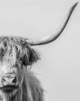 Een close-up van een Schotse Hooglander in zwart-wit, in natuurgebied Huis ter Heide in De Moer in Nederland. Het natuurreservaat wordt beheerd door Natuurmonumenten.
