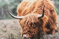 Portret van Schots Hoogland vee in de natuur. De Schotse Hooglanders worden gebruikt in het natuurbehoud op de Veluwe om ervoor te zorgen dat de heidegebieden niet dicht opeen groeien. De Highlander graast ongestoord tijdens een regenbui.