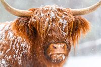 Portret van een Schots Highland vee in de sneeuw in de winter. De Schotse Hooglanders worden gebruikt in het natuurbehoud van de Veluwe om ervoor te zorgen dat de heidegebieden niet dichtbegroeid raken.