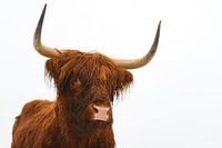 Portret van een Schotse Hooglander in de sneeuw tijdens de winter. De Schotse Hooglanders worden ingezet bij het natuurbeheer op de Veluwe om ervoor te zorgen dat heidegebieden niet dichtgroeien.