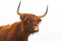 Portret van een Schotse hooglander met natte vacht in de winter. De Schotse Hooglanders worden gebruikt in het natuurbehoud van de Veluwe om ervoor te zorgen dat de heidegebieden niet dicht opeen groeien.