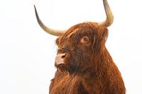 Portret van een Schotse hooglander met natte vacht in de winter. De Schotse Hooglanders worden gebruikt in het natuurbehoud van de Veluwe om ervoor te zorgen dat de heidegebieden niet dicht opeen groeien.