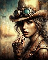 Een indrukwekkend portret van een steampunk dame waarvan de levendige texturen de expressiviteit van het kunstwerk benadrukken. Het gebruik van leer, studs en aardse kleuren versterkt de aanwezigheid van het prachtige gezicht en geeft de afbeelding een krachtige, fascinerende uitstraling.