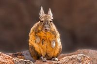 De foto toont een Viscacha, een knaagdier dat familie is van de Chinchilla, in vooraanzicht tegen een onscherpe achtergrond. Het knaagdier zit op de achterpoten en kijkt recht in de kamera. De foto werd gemaakt op de Altiplano in het Lauca nationaal park in het noorden van Chili op de grens met Bolivia