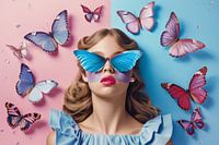 Dromerig surrealistisch portret van een jonge vrouw met vlinders als bril, omringd door pastelkleuren en zwevende vlinders. Een magisch en fantasievol kunstwerk dat romantiek en elegantie toevoegt aan elk interieur.