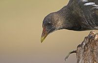 Deze waterhoen (common Moorhen) is op zoek naar wat lekkers. Naar beneden kijkend vanaf een paal heeft hij een goed overzicht.