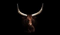 Dit indrukwekkende en krachtige langhoornige vee ligt doodstil en vredig op de grond in de camera te kijken. De mooie, glanzende bruine vacht en de lange, heldere hoorns zien er nog intenser uit door de zwarte achtergrond en de minimalistische stijl. Het spel van licht en schaduw wordt nog versterkt door de donkere negatieve ruimte.