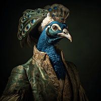 Dit AI-kunstwerk toont een majestueus tafereel waarin een pauw centraal staat, gekleed in adellijke kledij. Het verenkleed van de pauw is met uiterste precisie weergegeven, met rijke tinten van koningsblauw, smaragdgroen en glinsterende goudtinten. Elke individuele veer lijkt te stralen met zijn eigen unieke schittering, wat het…