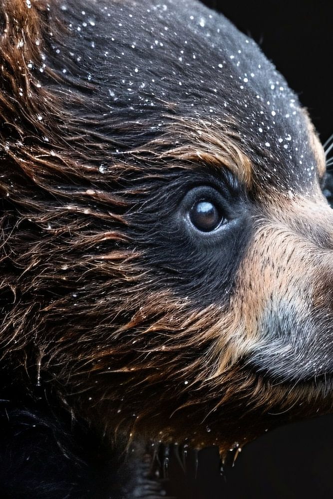 Deze adembenemende zwart-witfoto vangt de serene schoonheid van een beer in de regen. De regendruppels glinsteren op zijn vacht en creëren een gevoel van rust en kalmte. De intense blik van de beer trekt je mee in zijn wereld en laat je de natuur op een nieuwe manier ervaren. Dit kunstwerk is perfect voor iedereen die houdt van dieren, natuurfotografie en Minimalistisch esthetiek.
