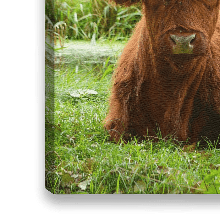 Koop dit schotse hooglander kunstwerk Portret van een bruine schotse hooglander in het gras van Trinet Uzun op canvas, aluminium dibond, (ingelijste) fotoprint, behang en ArtFrame, op maat geprint in Fine-Art kwaliteit.