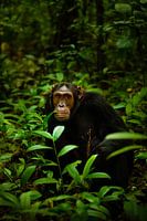 Een ontmoeting met een chimpansee in het regenwoud van Oeganda, Afrika.