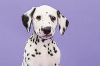 Portret van een schattige dalmatiër pup die je aankijkt tegen een paarse achtergrond.