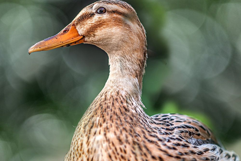 Portret van een gewone gespikkelde eend met een onscherpe bokeh achtergrond gemaakt in mijn achtertuin.