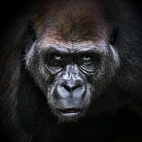 Dit is een krachtig close-up beeld van een gorilla en dat wordt versterkt doordat de omgeving rondom de gorilla zwart is gemaakt. Alle aandacht gat uit naar de gorilla zelf.
