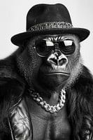Deze foto toont een gorilla, stijlvol gekleed in een leren jas en zonnebril. Hij draagt ook een halsketting en een hoed, waardoor een humoristisch en uniek beeld ontstaat.