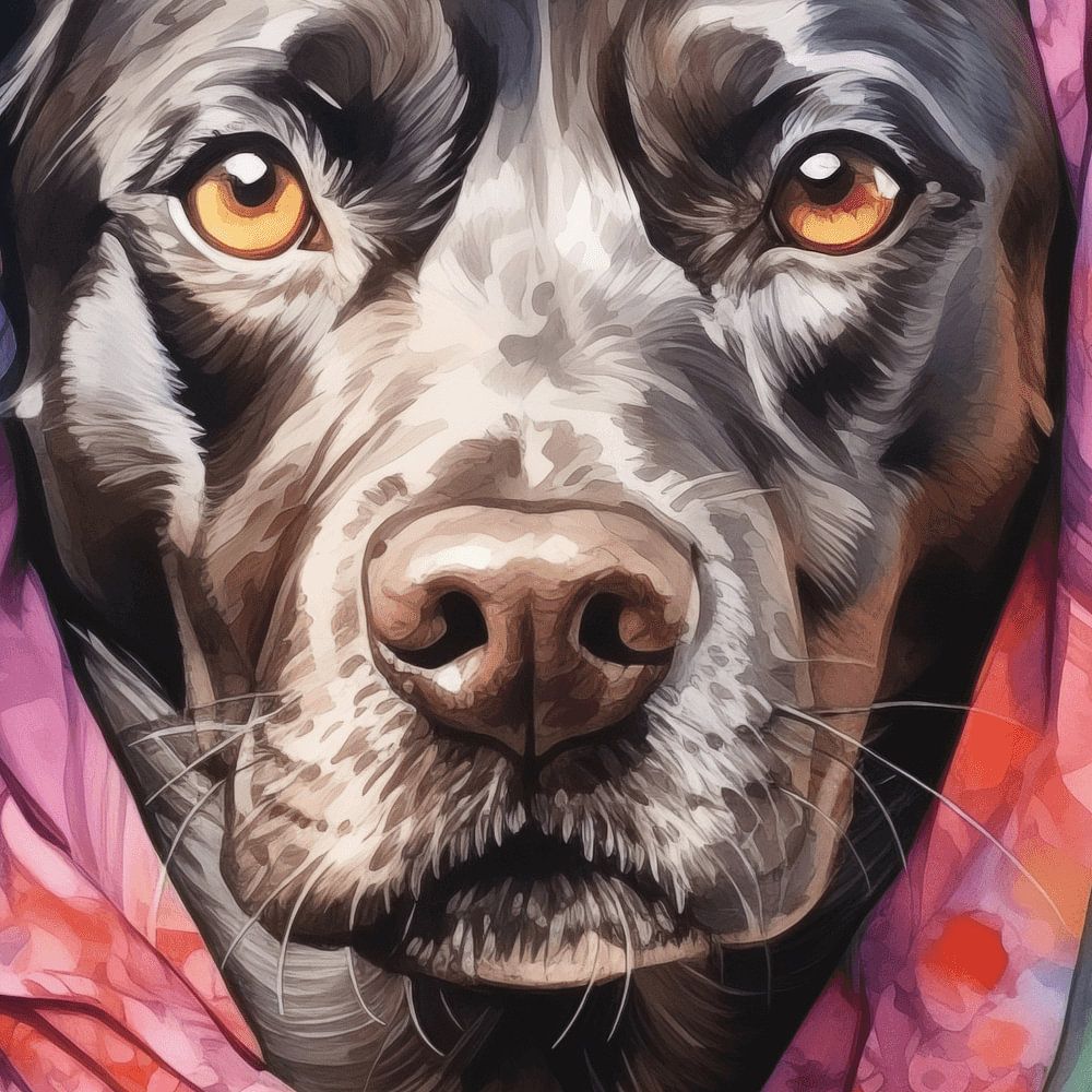 Portret van een hond geschilderd in aquarel met een kleurrijke hoofddoek op een witte achtergrond