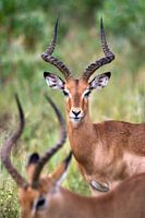 Hier heb ik geprobeerd om een aparte portretfoto te maken van een impala door te wachten totdat een andere impala op de voorgrond loopt. De timing en compositie moest wel perfect zijn, zodat de achterste impala goed zichtbaar op de foto komt. De foto is zoals het was, dus niet uitgesneden. Ik probeerde hiermee een standaard portret compositie van op 1 dier inzoomen te vermijden.