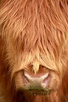 Een intiem beeld van de kop van een jonge Schotse Hooglander, waarbij de ogen volledig verborgen zijn achter de prachtige licht bruine vacht. Het haar valt speels over de kop dat het beeld een schattig karakter geeft. De textuur van de dikke, zachte haren en de neus en mond worden mooi benadrukt. De verborgen ogen geven een gevoel van nieuwsgierigheid en onschuld.