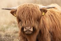 Foto van een Schotse Hooglander van voren gefotografeerd. De koe is relaxed aan het kauwen. En kijkt nieuwsgierig naar wat ik doe. Deze jonge Schotse hooglander os loopt op het Scharreveld nabij Westerbork. De foto is gemaakt in april 2023.