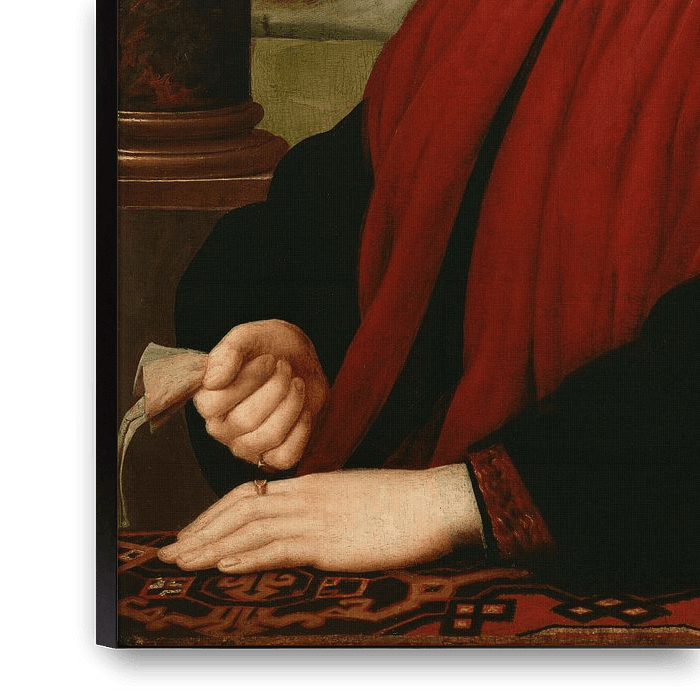 Een onbekende man, koel en ingehouden, staat trots voor een welvarend landschap met wellicht een portret van zijn eigen woning. De fijne maar ingehouden kleding, de directe blik en de trotse uitstraling kenmerken de nieuwe nadruk op individualisme in de Renaissance. De driekwart draai van het lichaam, met zijn arm als basis voor de driehoekige compositie, werd in die tijd een populaire pose; niet toevallig vestigt het de aandacht op de ring van de man en het fijne tapijt uit het Midden-Oosten dat de tafel bedekt.