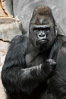 Portret van een krachtige dominante mannelijke gorilla (fysionomie), strak gezicht en krachtige arm.