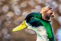 Portret van een kuifeend met zijn typische verentooi op t achterhoofd.