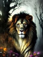 Een fantasie portret van een sierlijke leeuw in het bos. Op de voorgrond groeien gekleurde bloemen.
