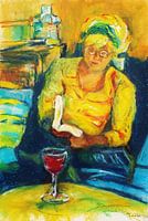 Figuratief portret van een lezende v rouw geschilderd met oliepastel. Zij zit heerlijk relaxed in een blauwe stoel met haar boek en een glas wijn. Een dagje niets doen wat is er fijner dan dat.
