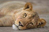 Tijdens een game drive kwam ik langs een group leeuwen die lekker lagen te luieren in het zand. Een van de leeuwinnen lag mooi languit met haar gezicht richting de auto.