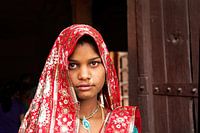 Portret van een meisje in India, Ze draagt een sari en opvallende sierraden.