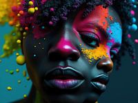 Deze foto toont een surrealistisch beeld van een Afrikaanse vrouw met twee gezichten omringd door een explosie van felle kleuren, die de kracht en levendigheid van haar uitstraling accentueren. Haar pose straalt trots en elegantie uit, terwijl de warme en heldere tinten rondom haar een boeiend contrast vormen met haar serene,…