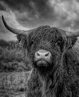 Portret foto van een stoere schotse hooglander koe tussen de regenbuien door. Digitaal bewerkt in zwart-wit met licht dramatisch effect.