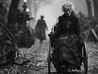 Portret van een oude vrouw in een rolstoel in de jaren 1930