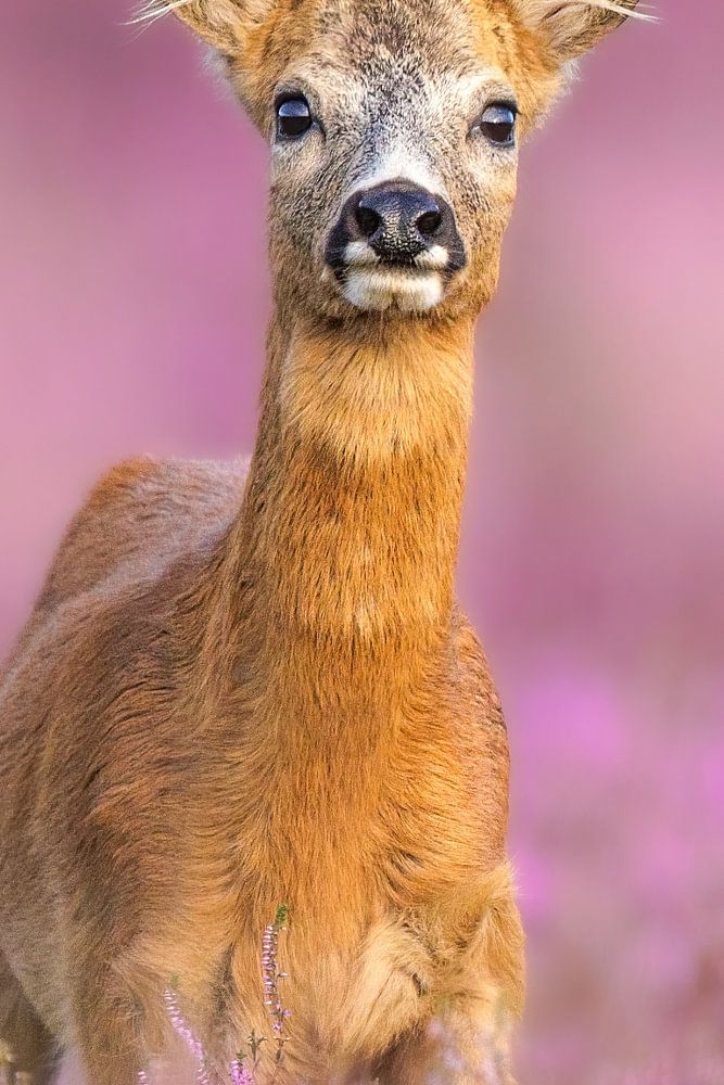 Deze reebok liep door de bloeiende heide. In het begin kwam hij rennend op ons af gelopen. Daarna bleef hij even staan om te inspecteren of er geen gevaar was. Dit moment dat hij even stilstond kon ik mooi gebruiken om hem goed vast te leggen in de paars/roze bloeiende heide.