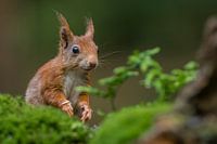 Portret van een rode eekhoorn (Sciurus vulgairs). De foto is gemaakt in een bos, waarbij de bodem van het bos goed bedekt was met mos.