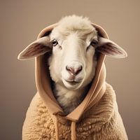 Deze kunst print toont een schattig schaap gekleed in een wollen trui met capuchon. Het schaap is afgebeeld in portretstijl en met zijn kop en schouders in close-up weergegeven. Het wol van de trui is pluizig en zacht en straalt warmte en comfort uit.