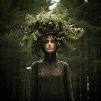 Deze kunstzinnige interpretatie van de 'bosvrouw' is een fascinerende weergave van de menselijke geest die in harmonie leeft met de natuurlijke wereld om ons heen.