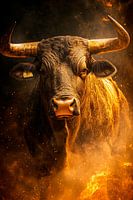 Een machtig dier verschijnt majestueus uit de vlammen, zijn ogen stralen vastberadenheid uit. De indrukwekkende, gebogen horens en het levendige spel van licht en schaduw geven deze afbeelding een dramatische diepte. Dit kunstwerk is perfect voor een woonkamer om kracht en karakter uit te stralen.